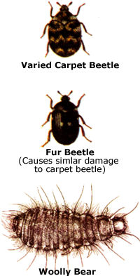 The larvae (known as “woolly bears”) of these small, oval beetles have outstripped the clothes moths as the major British textile pest. The Carpet Beetle is 2 to 4mm long, like a small, mottled brown, grey and cream ladybird. The related Fur Beetle is black with one spot on each wing case, and there is a rarer Black Carpet Beetle.